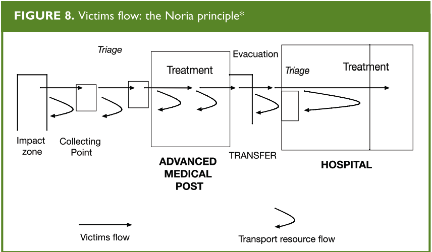 *This one-way progression from level to level by rotating transportation resources was labelled “Noria” in 1916 during the World War I battle of Chemin de Dames in Verdun, France. “Noria” comes from the Latin word for “wheel”. From: Establishing a Mass Casualty Management System, Washington D.C., 1996.